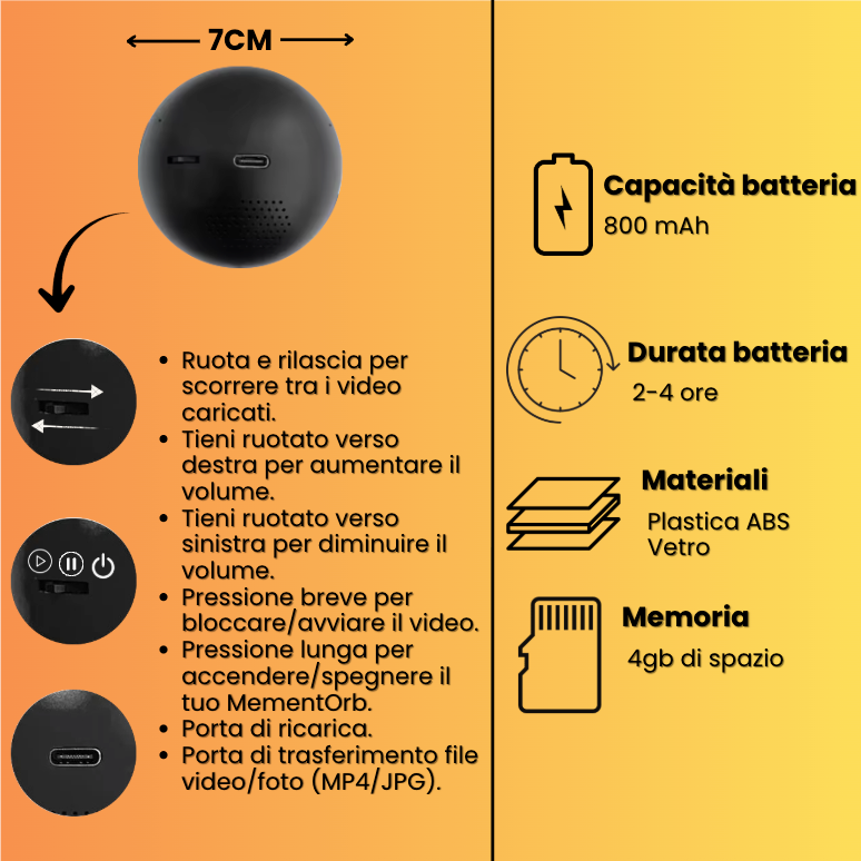 Garanzia tecnica di 1 anno su tutti i componenti. Se qualcosa non va, non ti lasciamo solo. Il nostro team è qui per te, sempre, perché capiamo che MementOrb™ non è solo un prodotto: è il custode dei tuoi momenti più preziosi.